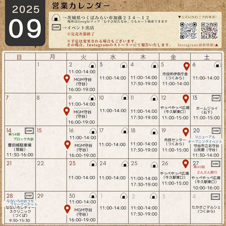 📅6月の出店スケジュールができました🍙✨ \むすび屋たなかの6月予定をチェック!/ 今月はイベント少なめ…そのぶん! 🎉6/21(金)・22(土)は【1周年祭】開催します✨ いつも応援してくださる皆さんへ感謝を込めて、 限定のお得な企画を準備中です💡お楽しみに! 🍙【基本の出店日】 🗓火・水・木は「いつもの場所」にて販売 ⏰11:00〜14:00(売り切れ次第終了) 📍茨城県つく...