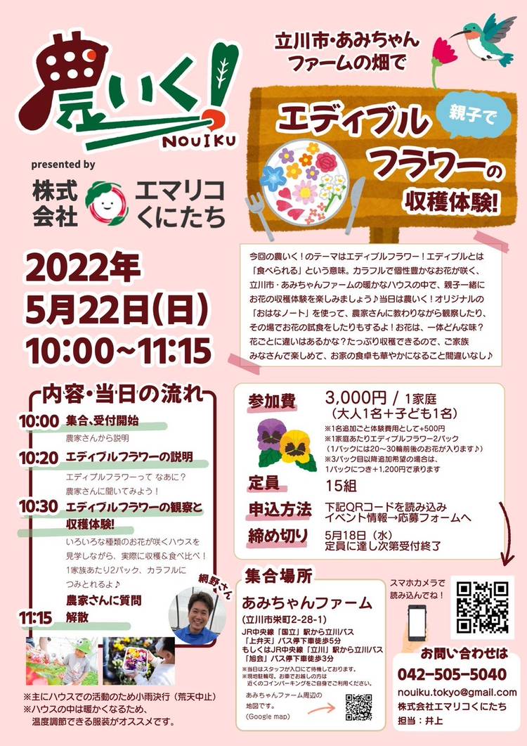 【農いく!親子向け農体験イベントのお知らせ】 6月25日(日)の1day体験は・・・ 国分寺市の畑で「親子で夏のじゃがいも掘り!」☀️🥔 今回は、毎年秋に大人気のじゃがいも掘りが夏にも登場🎶 お世話になる先生農家さんは、国分寺市・中村園芸の中村清治さん♩ 夏のじゃがいもがちょうど収穫を迎える季節、みんなでじゃがいもをコンテナいっぱいに収穫しましょう! 当日は、定番品種と色じゃがいもの2種類...
