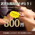 ◆炭酸ドライヘッドスパ(首・肩含む)30分 ¥4,000 弾ける炭酸泡で頭皮をほぐして脳までリラックス! 眼精疲労やストレスケアにも!首・肩 デコルテ含む ◆炭酸ドライヘッドスパ(首・肩含む)50分 ¥5,500 脳疲労、ストレス解消 睡眠の質UP☆頭の緊張をほぐし、自律神経を整える事で心身のリラックスを促進。 眼精疲労、肩こりにも◎ ◆オプションメニュー☆ヘッドスパ10分 ¥1,250 オプションメニュー。 お試しにヘッドスパやりたい方、もう少し長くやりたい方に! コースと合わせてご利用下さい。 ◆オプションメニュー☆ヘッドスパ20分 ¥2,500 オプションメニュー。 お試しにヘッドスパやりたい方もう少し長くやりたい方にオススメ コースと合わせてご利用下さい。 ◆忙しいあなたに!ヘッドスパ足裏リフレもみほぐし各30分の90分コース ¥9,000 短時間で全身スッキリ! 忙しい日常の中でもしっかりとリフレッシュしたい方におすすめのコースです。 ◆集中リフレッシュ☆ヘッドスパ50分ハンドリフレ20分コース頭と手の疲れを解消! ¥7,300 日常的に酷使している手や腕、頭皮をほぐしてすっきりリフレッシュ! 深いリラックスと共に脳疲労、眼精疲労をケア。 ◆ヘッドスパ30分×もみほぐし30分(60分)で疲労回復!! ¥6,000 忙しいあなたに最適。 仕事や家事で疲れた頭と身体を短時間でもしっかりケアできる気軽に通えるコースです。 ◆整う極上リセットコース☆ヘッドスパ30分もみほぐし60分 ¥9,000 深呼吸したくなるような心地よさ。優しく整う癒しの90分。 日々の疲れ、眠りが浅い方、気持ちもほぐしたい方にオススメ ◆ヘッドスパ30分もみほぐし90分とことんほぐす120分頭も身体もとことん癒すご褒美時間 ¥11,000 頭の重だるさも身体のコリや疲れもとことんリセットしたい方にオススメ スッキリ軽い身体と深い癒しの御褒美時間を是非!