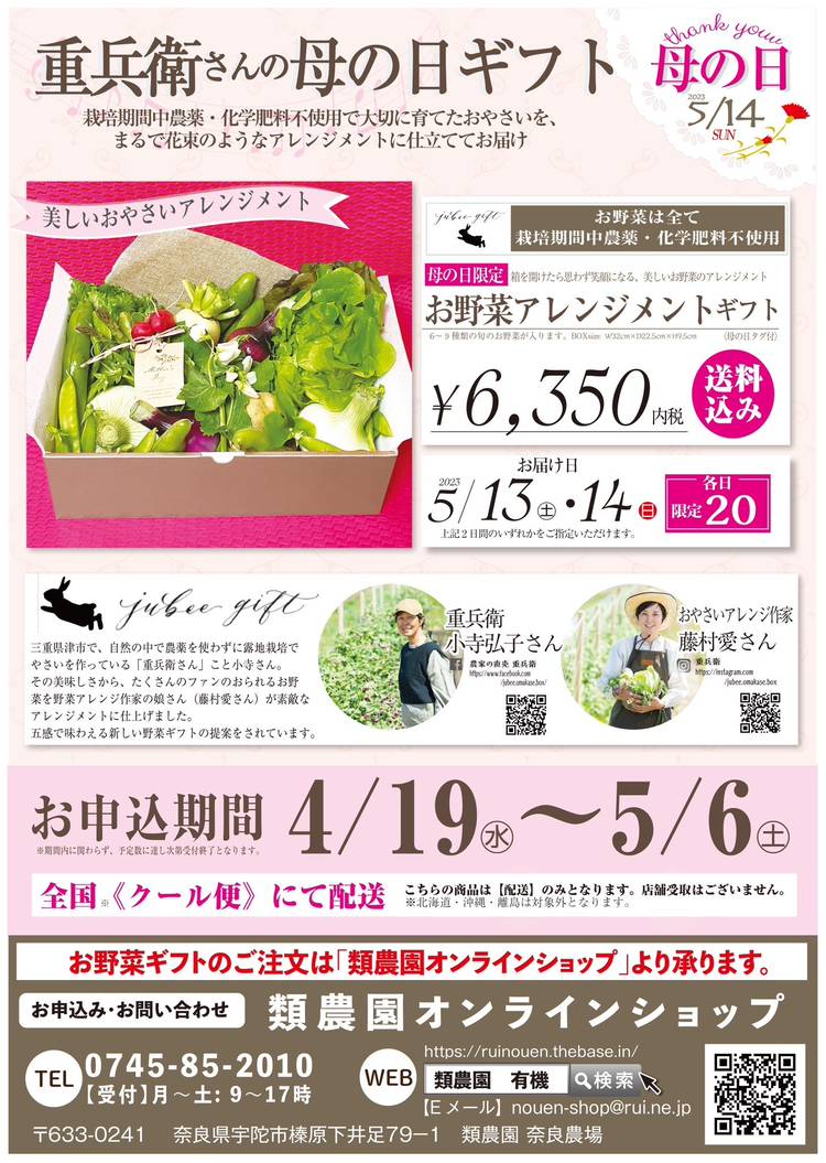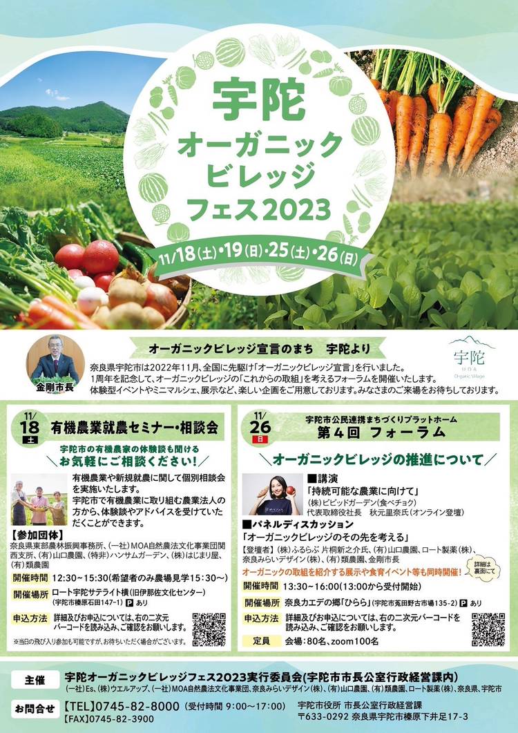 【宇陀市オーガニックビレッジ宣言から1周年!】 類農園・奈良農場がある奈良県宇陀市。 宇陀市は2022年11月、全国に先駆け「オーガニックビレッジ宣言」を行いました!! 宇陀市は、豊かな自然環境と大和高原地域の恵まれた気候等から、実は有機農業が盛んな地域なんです♪ SDGsへの対応や環境に優しい農業が求められている現代。 宇陀市は、有機農業推進の取組を起点とし、食と農の活性化により、魅力あ...