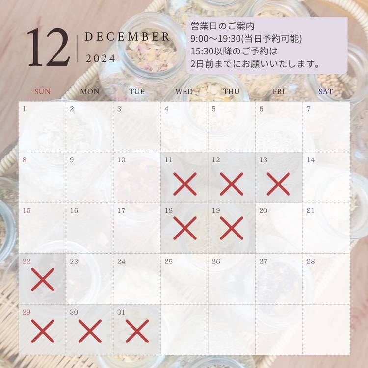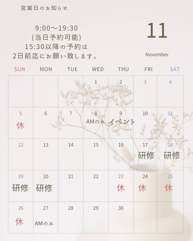 【11月の営業日のご案内】 すっかり寒くなってきましたが、昼間はまだ暖かい日も多く昼と夜の温度差が大きく体調をくずされ方も多いのでは? 身体の冷えを感じよもぎ蒸しのリピーター様やよもぎパックでお風呂時間を過ごされる方も増えています✨ また、乾燥は足裏や爪の大敵です💦 冷えや乾燥でお困りの方、ご予約お待ちしています✨ *・゜゚・*:.。..。.:・*:.。. .。.:*・゜゚・* 足専門の健...