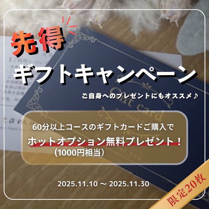 \先得ギフトキャンペーン開催/ クリスマスや年末年始でプレゼントの季節が近づいてきました🌲 大切なあの人や自分自身にドライヘッドスパを送ってみませんか? あたまッチではギフトカードをご用意しております。 11月中に購入希望のご連絡を頂いたお客様には、首肩をあたためて施術するホットオプション(1000円相当)をギフトカードに無料でお付けします🎁 ご希望の方は公式LINEより「ギフトカード...