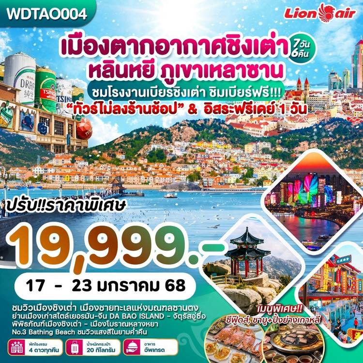 ✅4 ที่สุดท้าย ✅ 📍17-23 มกราคม2569 19,999.- 📍WDTAO004 “บินลงหลินหยี” แพ็คกระเป๋า พร้อมบิน! ชิงเต่าเมืองสุดคิวท์ เมืองตากอากาศชิงเต่า หลินหยี ภูเขาหลานซาน 7วัน6คืน 🔰สายการบิน Lion air (SL) 🇨�...