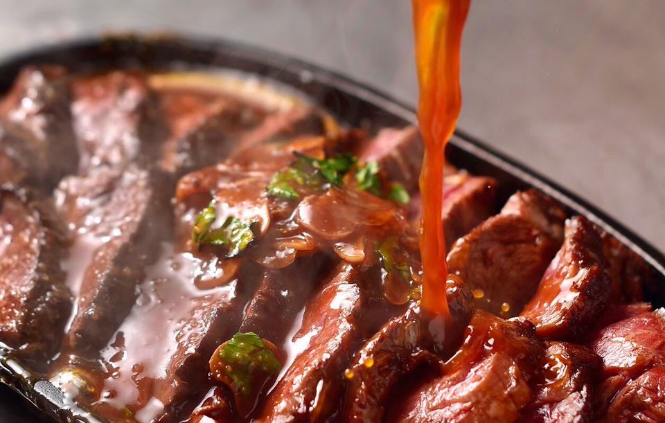 鉄板ハラミステーキ 200g 2690(2959)円当店の看板メニュー! 研究を重ねたホットソースをかけていただく鉄板ステーキ🔥🍖🐃 リピーター様続出のまた食べたくなる出来立て焼きたての美味しいステーキです。 ミディアムレアでお楽しみください😊