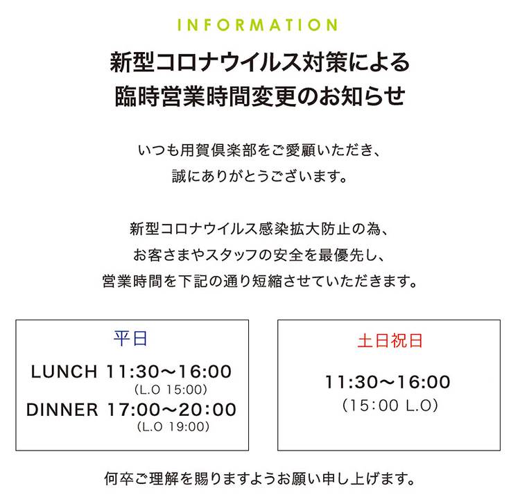 新型コロナウイルス対策による臨時営業時間変更のおしらせ いつも用賀倶楽部をご利用いただき、誠にありがとうございます。 新型コロナウイルス感染拡大防止の為、お客さまやスタッフの安全を最優先し、営業時間を短縮させていただきます。 何卒ご理解を賜りますようお願い申し上げます。 ※営業時間は今後変更になる可能性がございます。