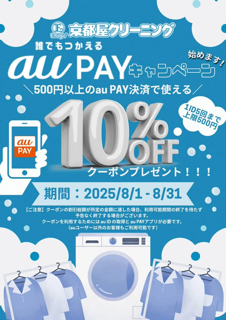 ◎auPAYキャンペーン◎ いつもご利用頂きありがとうございます♪ auPAYキャンペーンのお知らせです! 8月1日~8月31日の期間中、auPAYでご決済頂くと、 10%OFFクーポンがご利用いただけます🌸 1IDで5回まで、500円以上でご利用いただけます✨ ぜひこの機会にauPAYを活用して、お得にクリーニングをご利用ください! 暑い日が続いていますでの、体調お気をつけください🌻