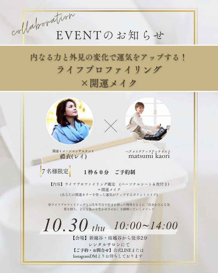 🌿ライフプロファイリング × 開運メイク🌿イベント開催のお知らせ🌼自分を深く知るライフプロファイリングと、印象を整え運を引き寄せる開運メイク𓈒 𓏸 𓐍 𓂃 ⚪日程:2025年10月30日(木)⚪会場:新越谷・南越谷駅から徒歩2分レンタルサロン⚪参加費:✨初回限定✨5000円自分らしさを知り、凛とした輝きをまといたい方へ。ぜひお待ちしております🌼