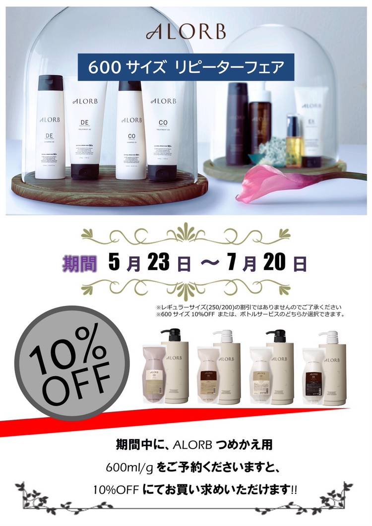 お世話になります。 Hair Salon Rayです。 当店で使用しているアローブのシャンプートリートメントのリピーターフェアのお知らせです。 興味のない方はスルーして下さい🙇♂️ 10/23〜12/20にかけて、詰め替え用600mlサイズ10%OFF or ディスペンサー(詰め替えボトル)サービスのキャンペーンを致します 天然由来原料•天然水を使用。 生分解性の良い原料を使用。 防腐剤不...