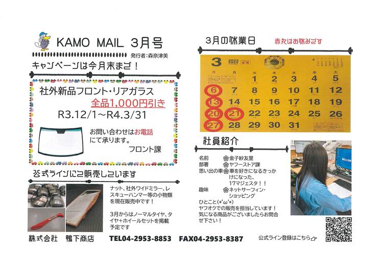 鴨下商店からのお知らせ『KAMO MAIL』 9月号です 今月は鴨下商店の決算月! ということで、解体車に関する嬉しいキャンペーン開催中です! 詳細はお楽しみ! 担当営業までお問合せくださいね 担当営業がご不明でしたら、04-2953-8853までお問い合わせ下さい