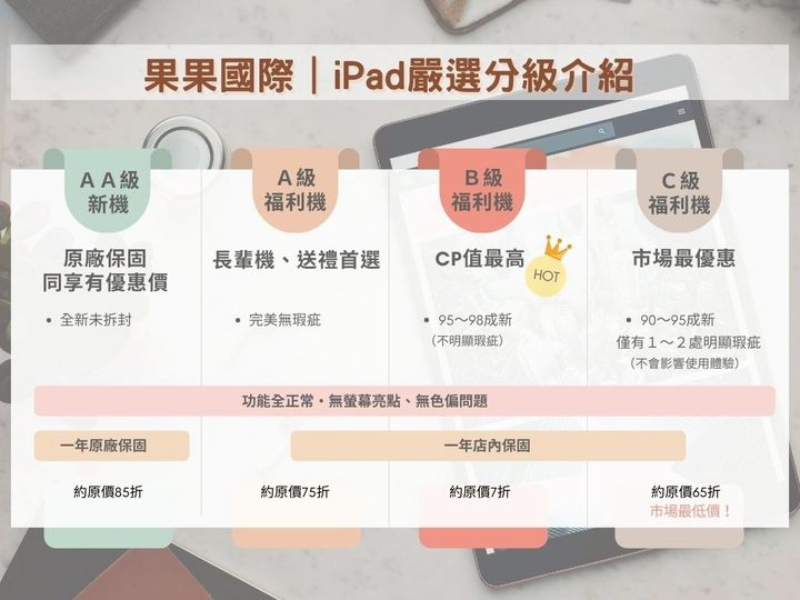 一張表秒懂iPad嚴選分級🔸AA新機(原價85折):全新原廠機,擁有原廠保固,價格比教育價更優惠!🔹A福利機(原價75折):完美主義最愛~近全新機,外觀完美無瑕疵♥️送禮的最佳選擇!🔸B福利機(原價7折):95~98成新,可私訊看照片或面交,僅有1~2處不明顯小瑕疵~CP值最高!🔹C福利機(原價65折)拼市場最低價,90~95成新,明顯瑕疵但完全不影響使用體驗!