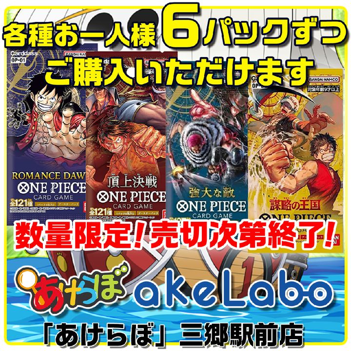 人気なワンピースカード第1、2、3、4弾のパック販売!何が出るか分からないけど、ワクワクする!各種お一人様6パックずつご購入頂けます!数量限定!あけらぼ三郷駅前店 店頭販売限定!LINE友だち限定!#謀略の王国 #ワンピカード #ワンピースカードゲーム #第4弾 #脳トレ #おもちゃ #知育玩具 #全品5%OFF #推し活 #三郷駅 #あけらぼ #あけらぼ三郷駅前店