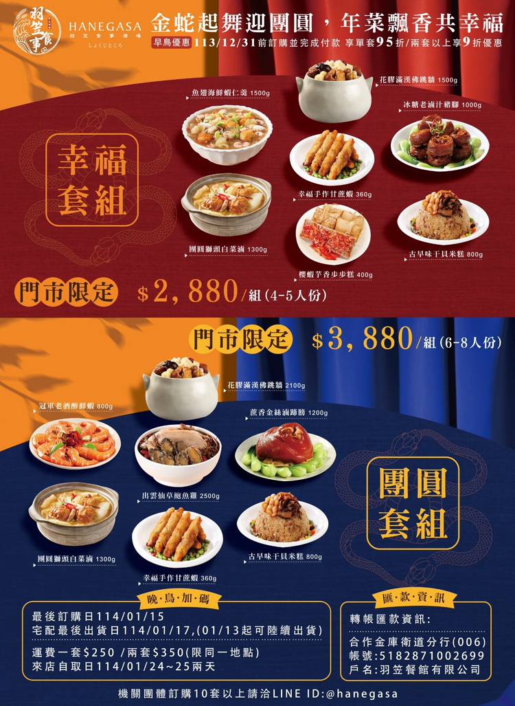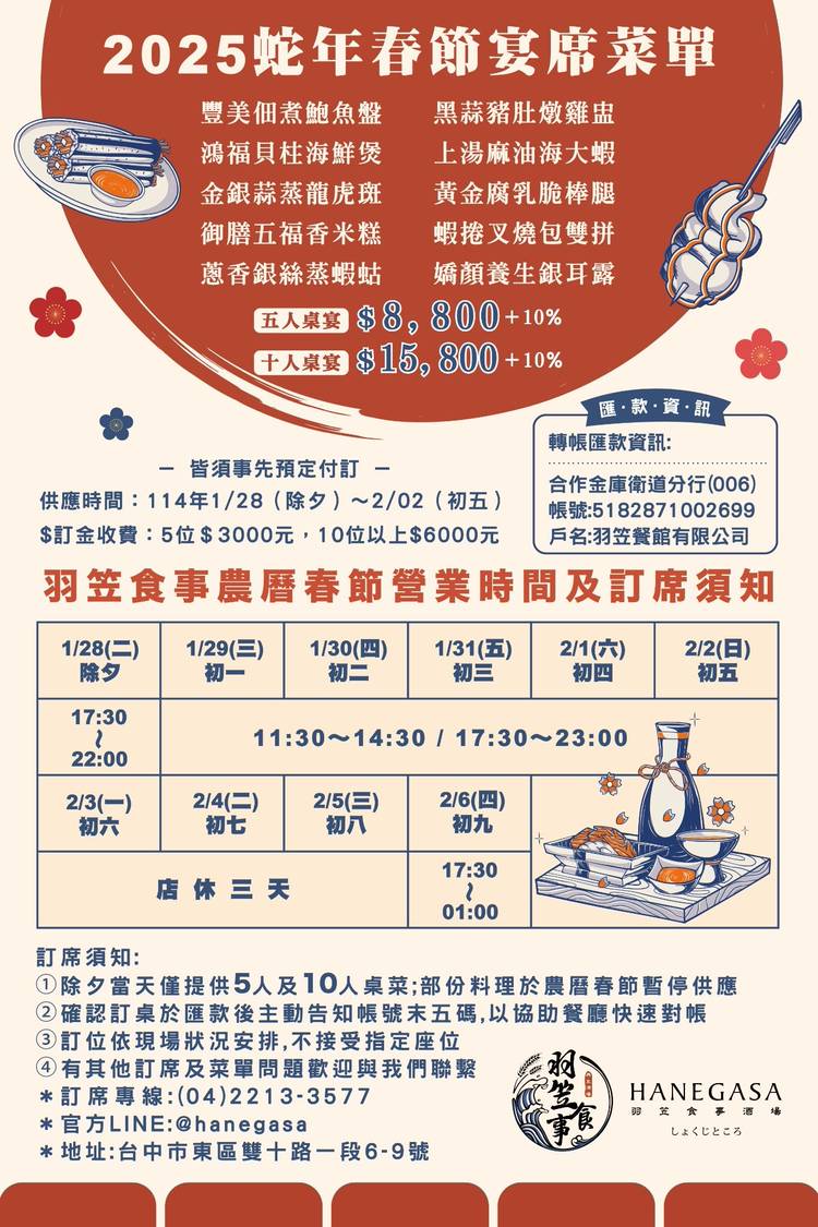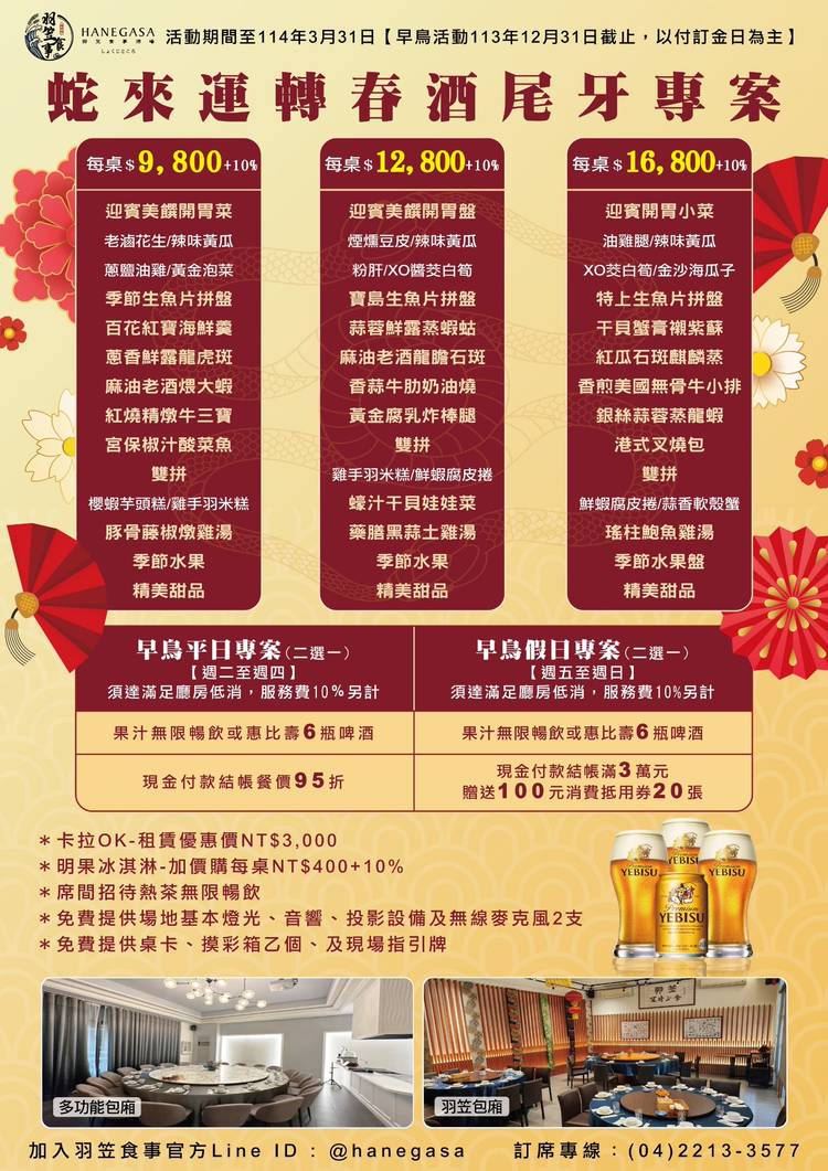 ✨ 羽笠食事 2026 尾牙春酒專案 ✨ ⚠️早鳥限定⚠️ 別讓您的年終盛會錯過「最高額回饋」! 即日起至 12/31前 ,凡預定尾牙/春酒訂席並完成付訂, 每桌立即加贈 $6,000 餐飲抵用券!💰💰💰 這不只是一場宴會,更是為您的未來餐飲精打細算! 早鳥回饋錯過不再,手刀搶訂,讓老闆滿意,同事開心! 🎁 限定優惠,搶先看! 🤑 早鳥優惠每桌現賺 $6,000 餐飲抵用券! (限...