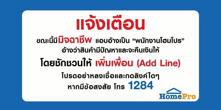 แจ้งเตือนขณะนี้มิจฉาชีพแอบอ้างเป็น "พนักงานโฮมโปร" อ้างว่าสินค้ามีปัญหาและจะคืนเงินให้ โดยชักชวนให้เพิ่มเพื่อน (add Line) โปรดอย่าหลงเชื่อและกดลิงค์ใดๆหากมีข้อสงสัย โทร 1284