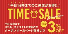 平日16時までのご来店で「メガネ・コンタクトレンズ」をお買い求めのお客様、クーポン、ホームページ価格より「さらに3%OFF」キャンペーン実施中!!