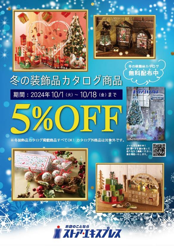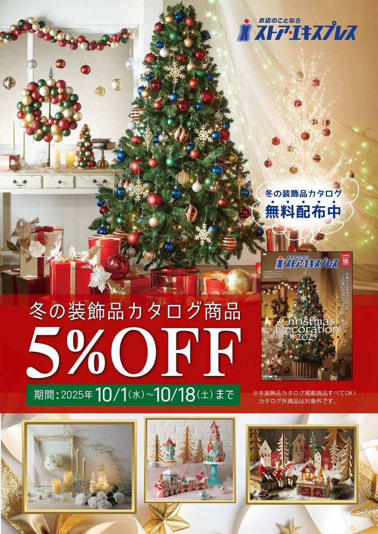 2025年のクリスマス、正月用品が掲載されている、「2025冬装飾品カタログ」を発刊しました!それに伴い、10/18(土)まで「早期受注5%OFF!」のキャンペーンを実施します!! ストア・エキスプレス大阪本店ではクリスマス商品のサンプルを、昨年より拡大して展示しております。 是非ご来店くださいね。
