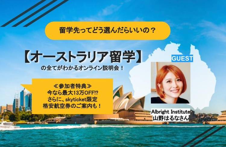 【オーストラリア留学:無料オンライン説明会】12月4日(月)18時開催🎓 ▼▼詳細/申込はこちら!▼▼ https://skyticket.jp/study-abroad/article/12674/ 《参加者限定》 ・今なら最大13万円OFF!?🏫 ・さらにskyticket限定の格安航空券で留学できるチャンスも!🛫 オーストラリア4都市にキャンパスのあるAlbright Insti...