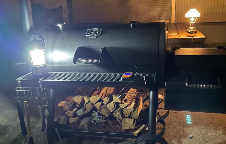 アメリカ、オクラホマジョーズ製オフセットスモーカーを使い燻製しております。