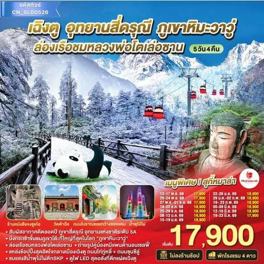 ❄️ ตะลุยเส้นทางสุดอลังการ “เฉินตู” สัมผัสความงาม 4 อุทยานชื่อดัง 🏔️ อุทยานภูเขาสี่ดรุณี – ทิวทัศน์หิมะปกคลุมสุดโรแมนติก 🚠 อุทยานปี้เผิงโกว – จุดชมวิวหิมะกลางหุบเขา 🌲 อุทยานจิ่วจ้ายโกว – ดินแดนธรรมช...