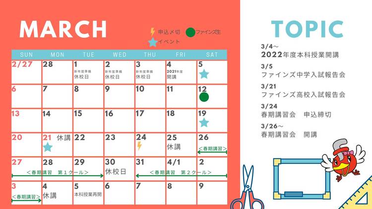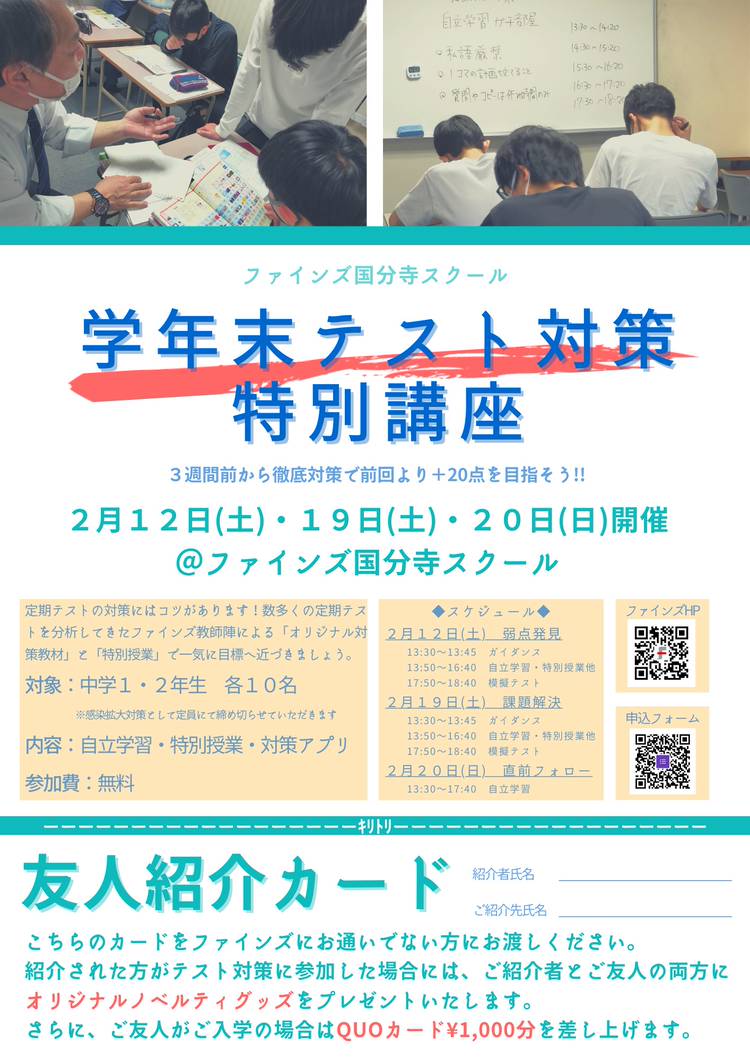 【2学期期末テスト対策】 学校行事に盛り上がるシーズン。秋の夜長を楽しむ中学生のあなたにお尋ねします。 >>11月に期末テストが待っていることは覚えていますか??<< ファインズのテスト対策は3週間前から始めて、計画的に学習を進めます。 テスト前の過ごし方が分かる!提出物がしっかり終わる! ぜひ無料の特別講座にご参加ください。 <実施概要> 第1弾 10月24日(月)19:00〜21:00 ...