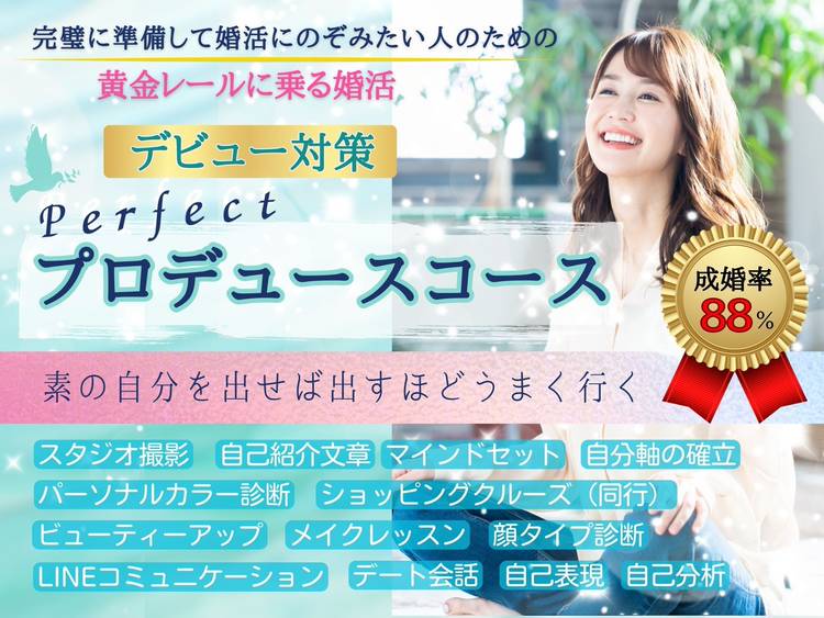 【婚活向け✕自分らしさ】を融合した「メイクレッスン」や「カラー診断」でビューティーアップして、華やいだ気持ちで婚活をスタートできる婚活プランが大人気です。 婚活をパーフェクトに準備して、効率よく成婚を引き寄せるための「ファッション診断」と「ショッピング同行」で、楽し活準備を進めます。 『【パーフェクト】デビュープロデュースコース』では、お見合いが始まる前に、1ヶ月かけて、内外面の準備をします。