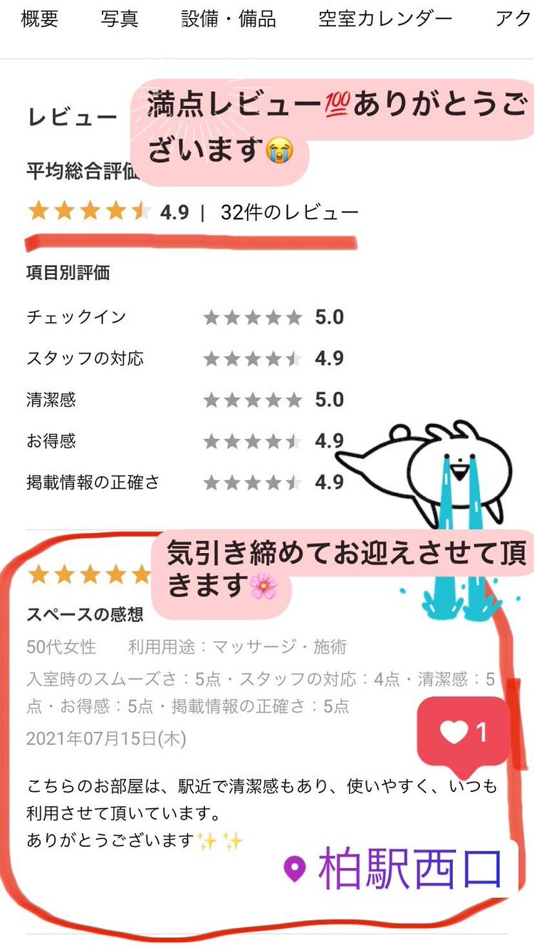 レンタルサロン/柏駅徒歩3分/エステ・リラクに最適 施術スペースをお探しの方に必見! 完全個室 陽当たり良好です! 柏駅 徒歩3分 アースライト製の高級施術ベット 調光ライト 大きな鏡 超音波アロマディフューザー ブランケット各種 Bluetoothスピーカー完備 【レンタル可能業種】 ・エステ、アロマ、リラク ・ネイル ・ヨガ、タイ古式 ・フェイシャル・マツエク ※他要相談 【...
