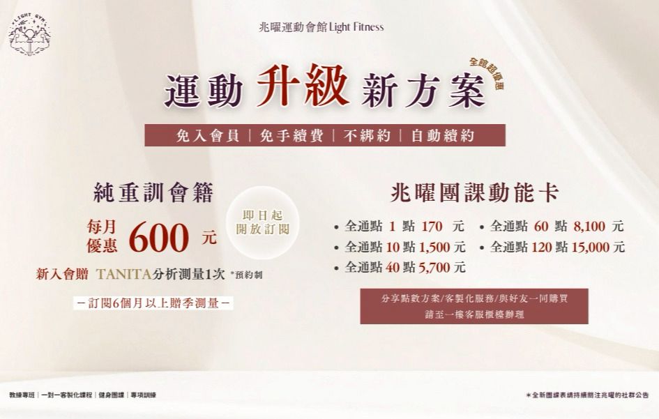 教練單堂 2,000元 每月皆有相關優惠,歡迎洽櫃台詢問 【客製化1對1方案】體驗價1,200元 1對1客製化訓練 10 堂| 優惠價15,000元(單堂1,500元/人) 1對1客製化訓練 30 堂| 優惠價39,000元(單堂1,300元/人) 【客製化1對2方案】體驗價2,000元 1對2客製化訓練 10 堂| 優惠價25,000元(單堂1,250元/人) 1對2客製化訓練 30 堂| 優惠價69,000元(單堂1,150元/人) *體驗後當日購課,可折抵等額課程費用 歡迎聯繫客服或填表詢問: https://forms.gle/rJz3tyDkpq5spLZE8 ✨每月皆有相關優惠,歡迎洽櫃台詢問✨