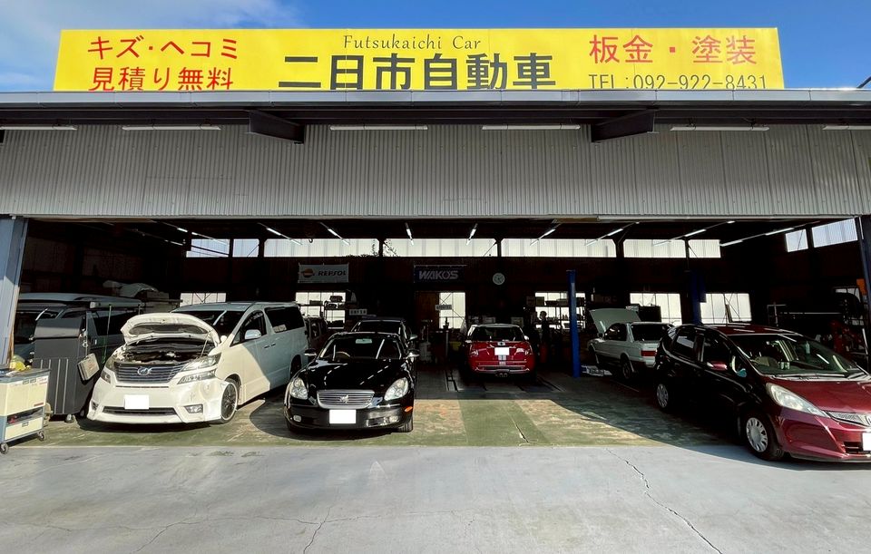 福岡県筑紫野市の二日市自動車です。筑紫野市役所、二日市南コミュニティーセンターの向かいにあります。鈑金塗装・車検・整備・点検・事故修理・キズへこみ直し・保険修理・メンテナンスは是非弊社にお任せください!