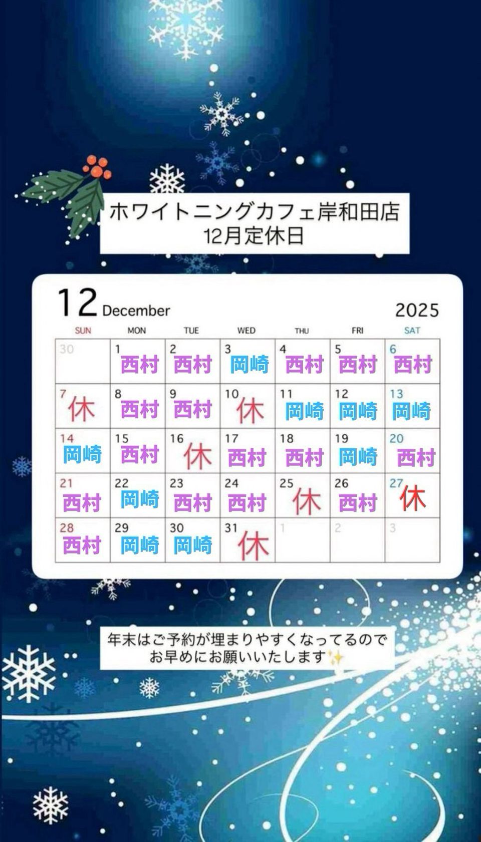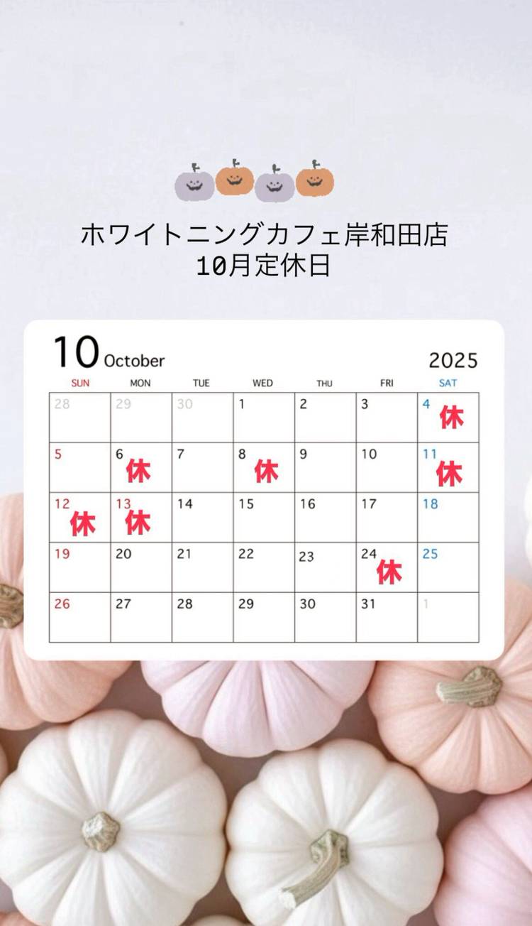 ホワイトニングカフェ岸和田です🍁 いつもご利用ありがとうございます😊 11月の定休日カレンダーになります ご予約の際はご注意くださいませ❕ 土日祝、週末は埋まりやすくなっておりますので お早めのご予約をオススメします🥺