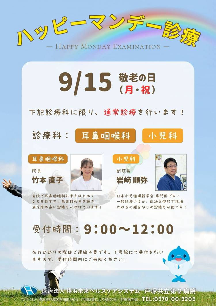 2025年9月15日(月)祝日に、耳鼻咽喉科・小児科のみ通常診療を行います。急患の方や平日に受診できない方など、是非ご利用ください。