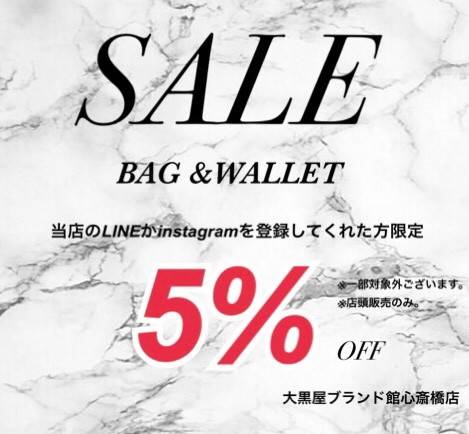 🌟お知らせ🌟 当店インスタグラムフォローまたはLINE登録して頂いた方限定 バッグ&ウォレット 5%OFFセール開催中💖 この機会に是非お買い求め下さい🤭 ※一部対象外商品ございます。 ※店頭販売のみのご対応でございます。 ※心斎橋店のみ対象でございます。 ブランド館心斎橋店