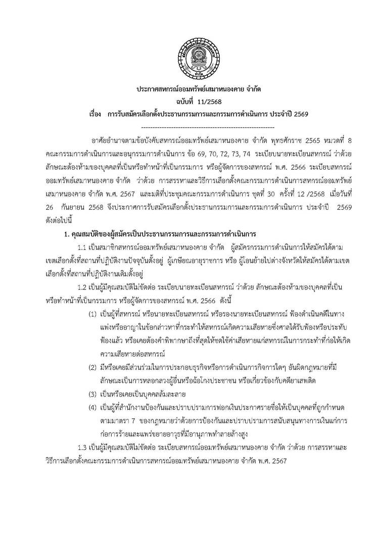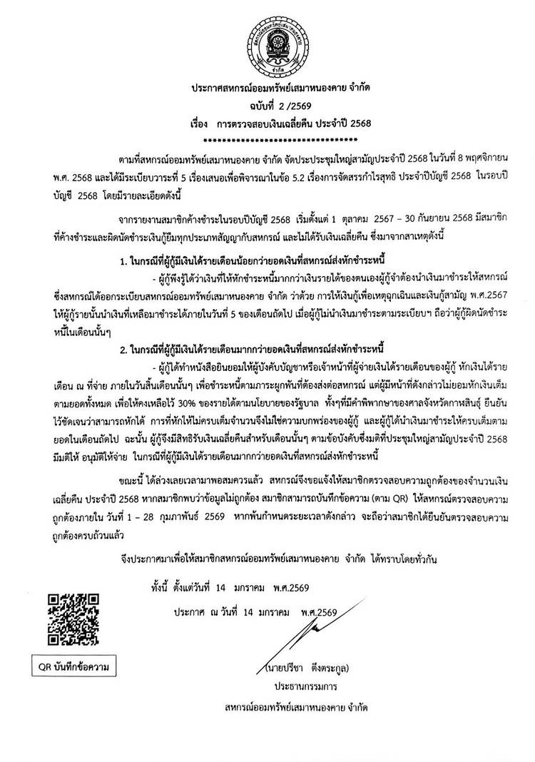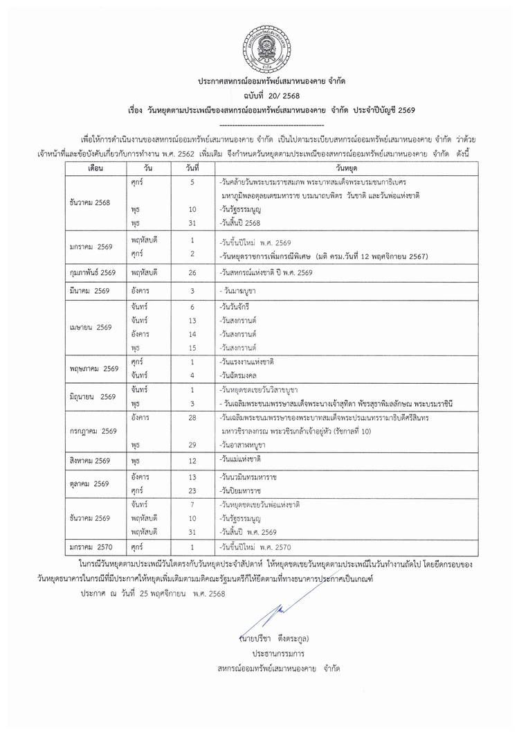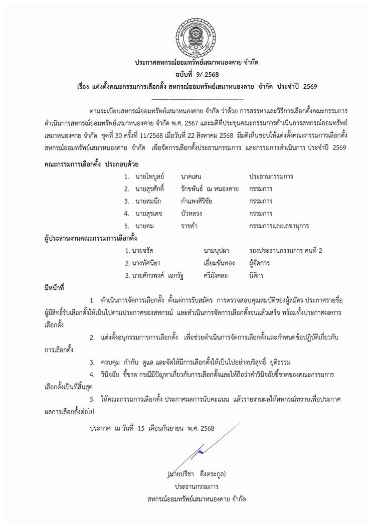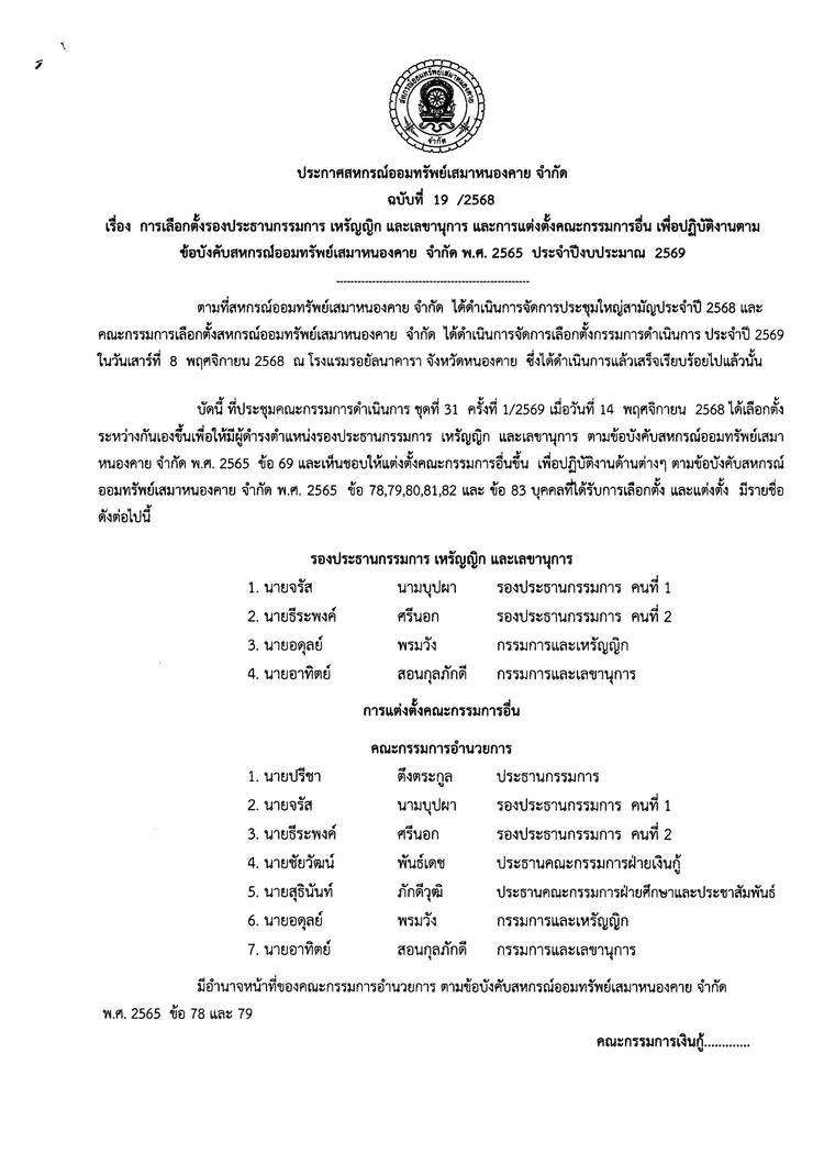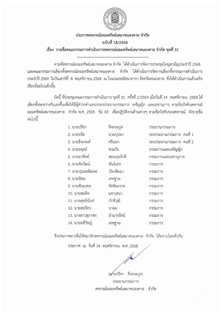 ประกาศสหกรณ์ออมทรัพย์เสมาหนองคาย จำกัด ฉบับที่ 1 / 2569 เรื่อง การแต่งตั้งที่ปรึกษาและที่ปรึกษากิตติมศักดิ์ ประจำปี 2569