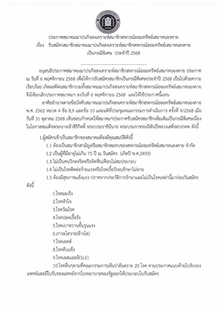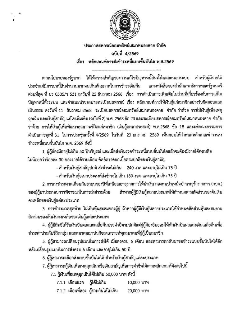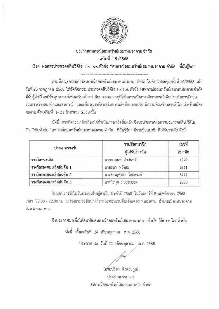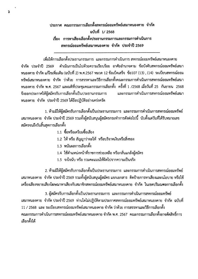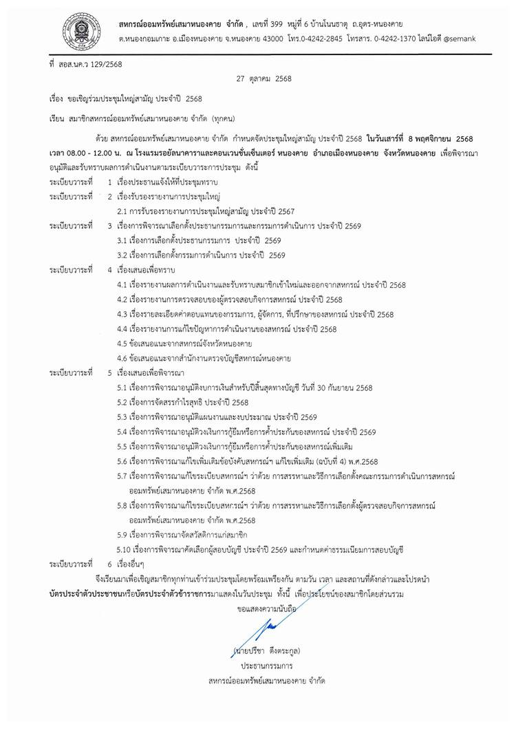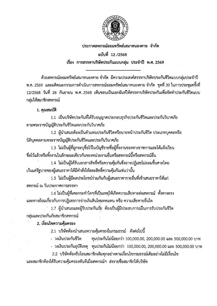 ประกาศสหกรณ์ออมทรัพย์เสมาหนองคาย จำกัด ฉบับที่ 1 / 2569 เรื่อง การแต่งตั้งที่ปรึกษาและที่ปรึกษากิตติมศักดิ์ ประจำปี 2569