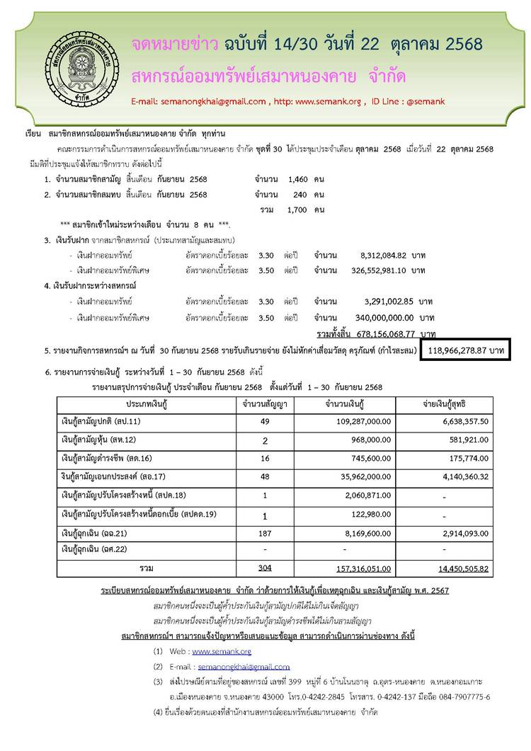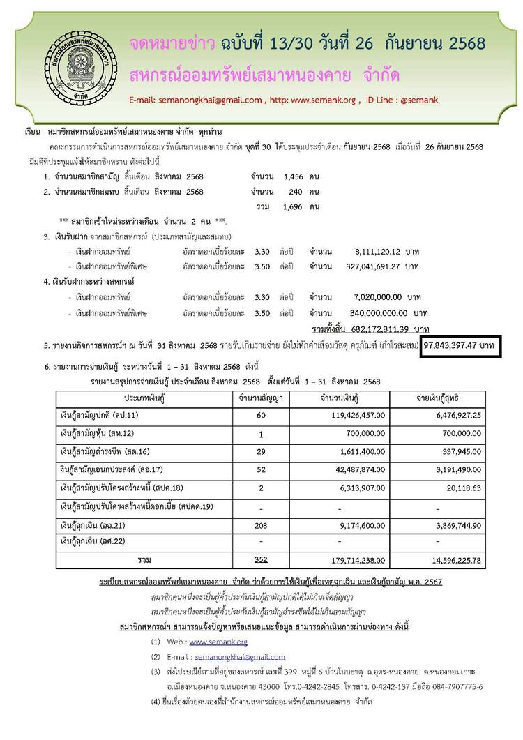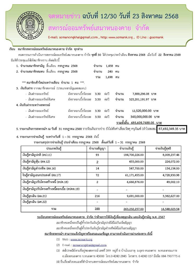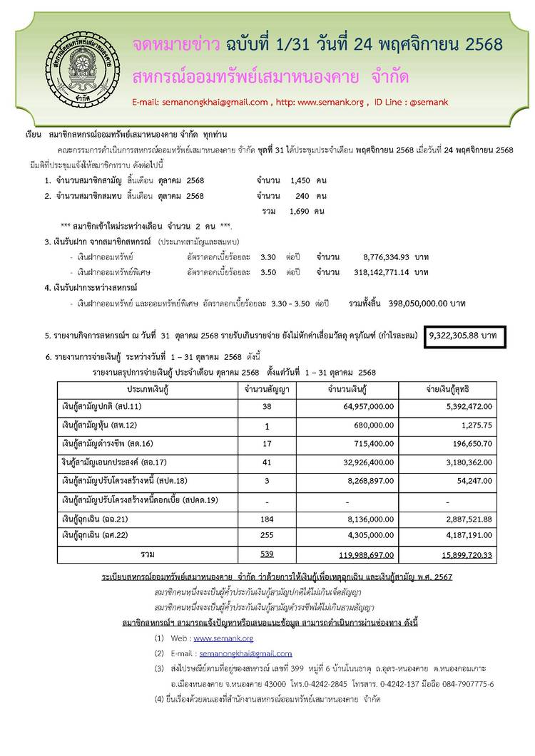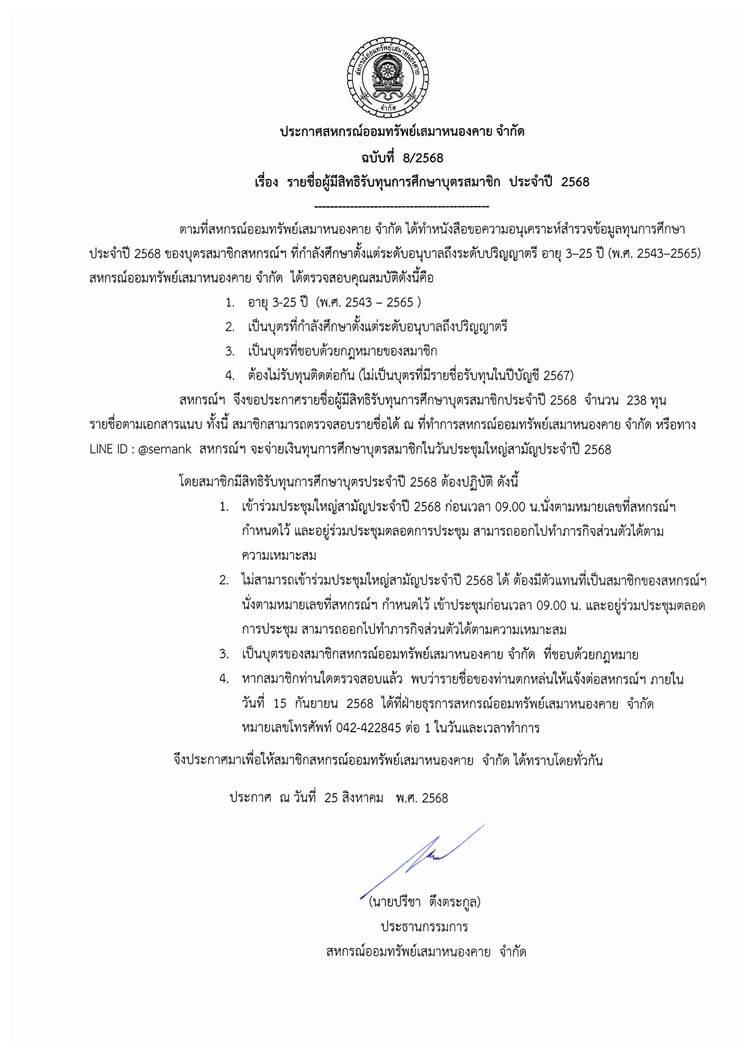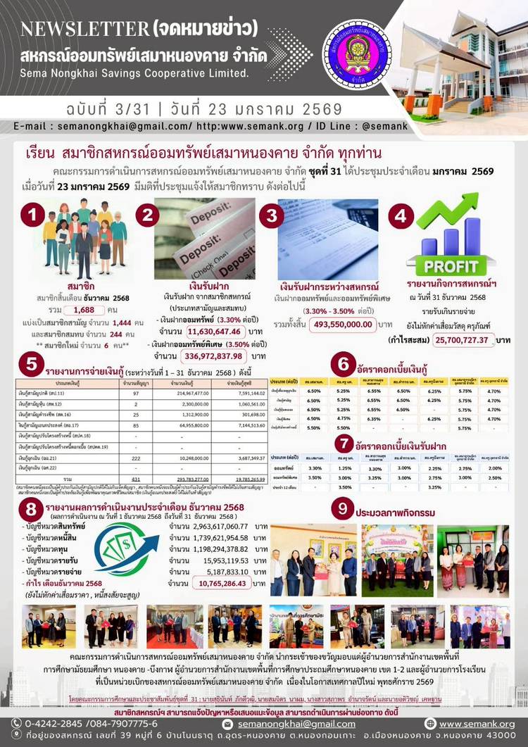 ประกาศสหกรณ์ออมทรัพย์เสมาหนองคาย จำกัด ฉบับที่ 1 / 2569 เรื่อง การแต่งตั้งที่ปรึกษาและที่ปรึกษากิตติมศักดิ์ ประจำปี 2569