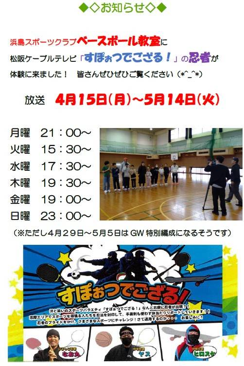 (star)イベントのご案内(star)(!) お待たせしました(blushing smile) 『第14回スポーツまつり』開催のご案内です(double arrow right) 皆さまのお越しをお待ちしております。(double arrow right) (double arrow right)日時 11/30(日)9:00受付開始~10:00開会式~13:30終了予定 ※雨天中止 ...