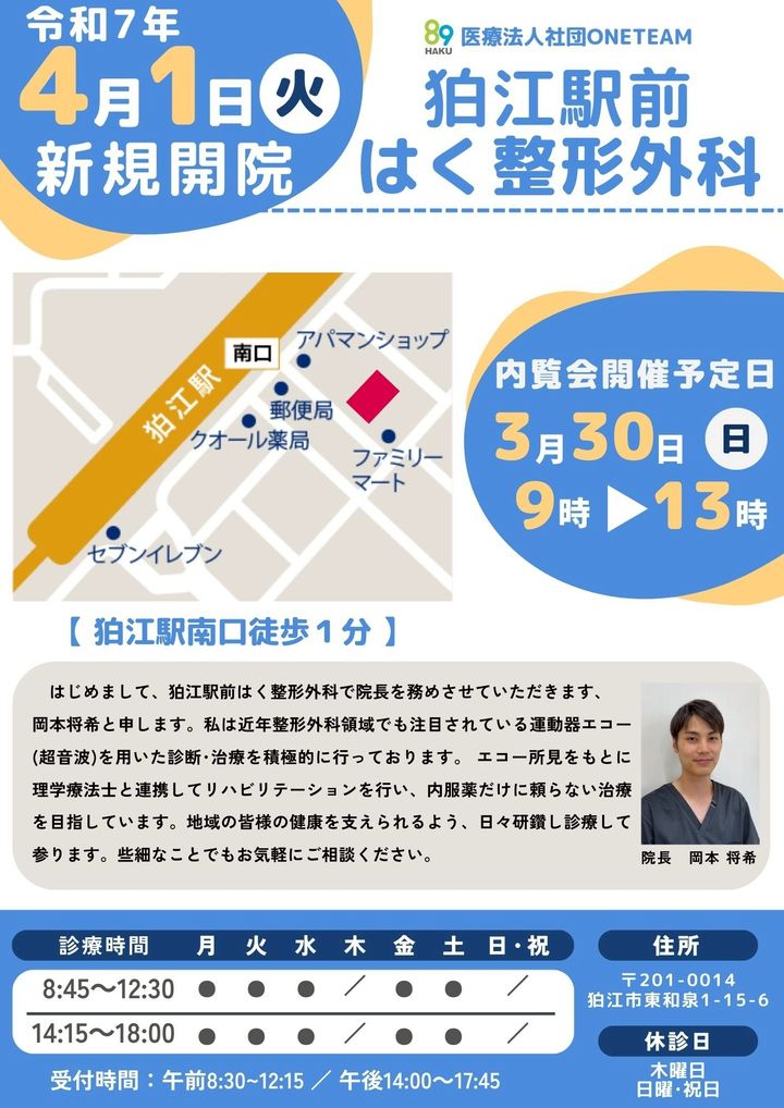 令和7年4月1日(火)に医療法人社団ONETEAM4つ目の整形外科クリニックが新規開院いたします!開院に先立ちまして、3月30日(日)9時〜13時まで内覧会を開催いたします。皆様のご来院お待ちしております😊