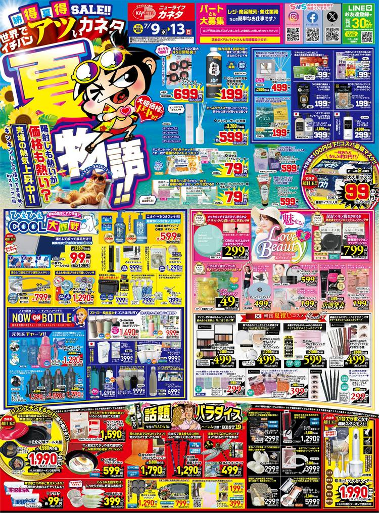 ☀️夏物語☀️納得夏得SALE🌈 世界でイチバン❔アツいカネタ😄 明日7月9日(水)~7月13日(日)まで 24店舗にて開催いたします~✨ WEBチラシ https://new-life-kaneta.com/flyer.html 皆様のご来店をお待ちしております✨