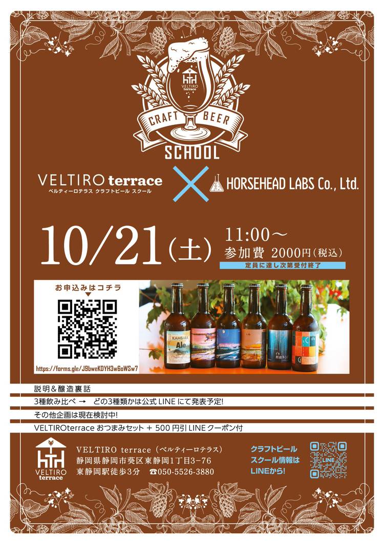 VELTIROterrace クラフトビールスクール 第1回 VELTIRO×アオイビール 開催決定! 参加費: 2,000円 ・アオイビール3種飲み比べ +それぞれのモルト味見 ・VELTIRO terrace おつまみ付き ★参加者にはVELTIRO terrace 500円引LINEクーポンプレゼント🎁 開催日: 2023 年 7月 30日(日) ①11:00~ ②15:00~ ...