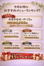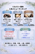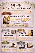 高い技術力と丁寧な接客で頭から足裏まで丁寧にもみほぐします。疲れている部位を重点的にもみほぐすことも可能ですので、施術前にお伝え下さい。 施術中に気持ち良すぎて眠ってしまう方が続出で、頭・首・肩・背中の疲れ・眼精疲労など全身の疲れ・コリを改善いたします。お時間の延長も承っておりますので、セラピストにお伝え下さい。 ・30分:¥3,600 ・45分:¥4,600 ・60分:¥6,800 ・90分:¥9,100 ・120分:¥12,000 ・10分※ボディケア追加したい方:¥1,400