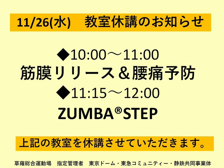 11/26(水) 草薙教室 10:00-11:00 筋膜リリース&腰痛予防 11:15-12:00 ZUMBAⓇSTEP インストラクターの都合により急遽休講とさせていただきます。 ご迷惑をおかけし申し訳ございません。 ご理解のほどよろしくお願いします。