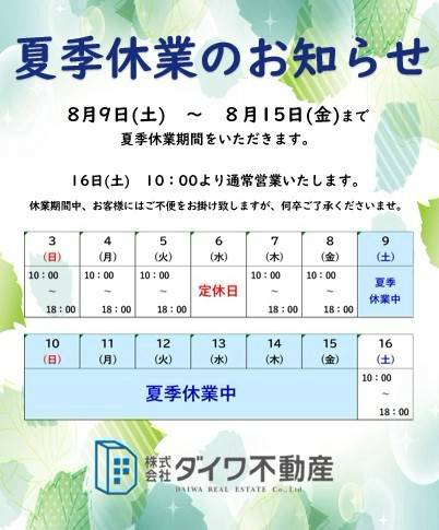 夏季休業期間をいただきます。 2025年8月9日(土)〜8月15日(金) 休業期間中のホームページ、各種WEBサイト、公式LINE、入居者専用アプリ『totono』 等からのお問合せ、ご依頼に関しましては、8月16日(土)に順次対応いたします。 ご返答までにお時間を頂戴しご不便をお掛け致しますが、何卒ご了承くださいませ。 お部屋のご解約のお客様は、書面又は入居者専用アプリ『totono』で...