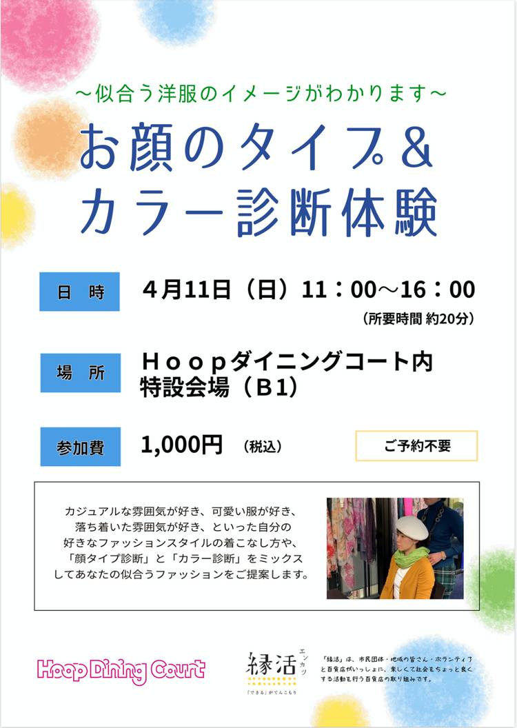 マンツーマンでお悩みに合わせた色選びをアドバイスします。 ・基本メニュー カラー診断➕顔タイプ診断(20分)1000円 ■肌がきれいにみえる「カラー診断」 ■お似合いのファッションスタイルがわかる「顔タイプ診断」 ・オプションメニュー 骨格診断(30分)1000円 診断結果をもとに、あなただけのファッションレシピとしてお渡ししています。 ■セルフ診断してみたけど良くわからない ■似合うものと自分の好みが違っている ■就活のメイクで悩んでいる ■夏休みだけヘアカラーしてみたい ■年齢より若々しくみせたい ■旅行に持っていく服を少なくしたい ■写真写りを良くしたい ■自分の好きなイメージのお部屋にしたい ■デートに着ていく服が決まらない 等々、女性ならではの悩みは尽きません。 色の簡単なルールとスタイルアップの方法を知ることで、あなたのお悩みは解決します。 断捨離にも最適です。 お持ちの洋服、メイク用品、アクセサリーなどアイテムを持ち込み可。 お悩みに合わせて組み合わせ方、コーディネイトなどとアドバイスいたします。 またはインテリアや洋服の写真を撮っていただければ、それを元にアドバイスも可能です。 色に関わるどんなお悩みでもお気軽にご相談ください。 お1人様1回約20分のカウンセリングになります。