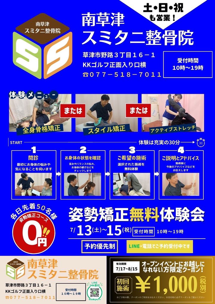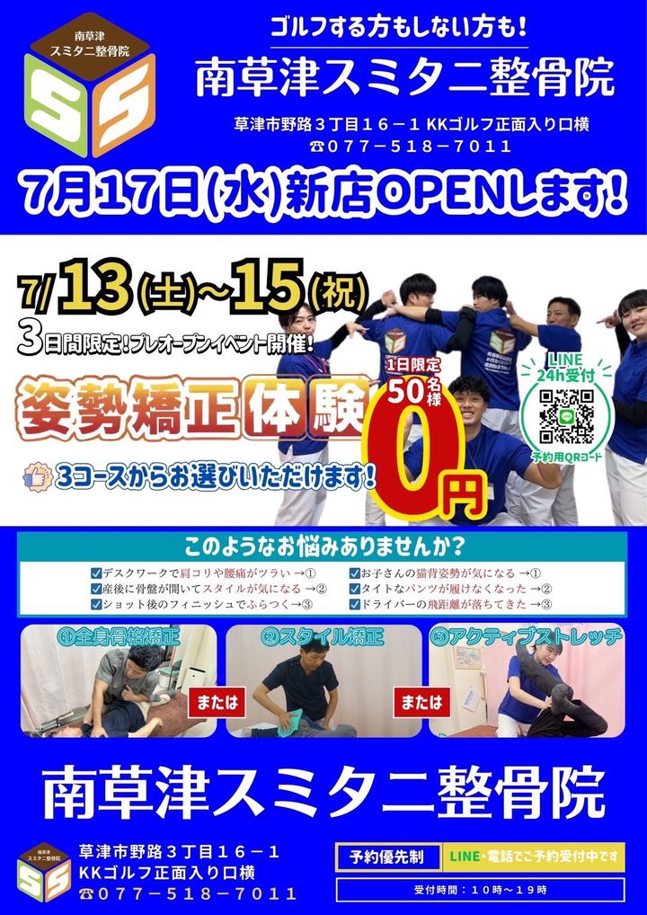 7月13日(土)〜15日(月)3日間プレオープンで無料体験会を行なっております😌❗️①全身骨格矯正②スタイル矯正③アクティブストレッチこの3つの中からご希望のメニューをお選びいただけます✨グランドオープンは7月17日(水)👏㊗️たくさんのご予約お待ちしております🎉✨