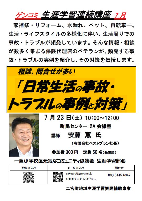 詳細はこちら→ https://gen-comi.jp/wp/?p=4497/23 生涯学習連続講座:相談、問合せが多い「日常生活の事故・トラブルの事例と対策」日 時:7月23日(土)10:00~12:00場 所:町民センター 2A会議室講 師:安藤 薫 氏(有限会社ベストプラン社長)参加費:300円定 員:50名(先着順)