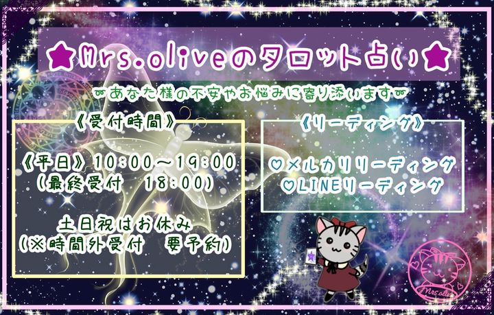 《★Mrs.oliveのタロット占い★》サイトにて受付しております。 ---------- ◯《料金》 『通常リーディング』1000円 『リアルタイムリーディング』1100円 (その他オプション有り) ・お支払い方法 メルペイまたは銀行振込 ---------- ◯《必要事項》 ・あなた様のお名前 (ニックネーム可) ・占いたいお悩み、不安の詳細 ・質問等4回迄 ---------- ※ご質問は、必ず一度にまとめてお送りください。まとめられていない場合は、送られた分のご質問のみのリーディングとなりますので、ご注意ください。 ---------- ○『通常リーディング』 ご購入いただきまして、お支払い&《必要事項》を確認後から24時間以内に、ご質問全ての結果を一気にお伝えいたします。 追加でご質問をご購入いただいた場合、お答えにお時間をいただきます。 ○『リアルタイムリーディング』 日時を決められてご予約、当日の開始時間からスタートしまして お一つずつお話を聞きながらのリーディングとなります。 (約1時間~2時間程度)
