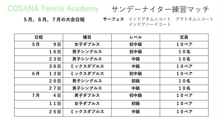 みなさんこんにちは😃 コサナテニスアカデミーです🎾 先日サンデーナイター練習マッチが初開催されました! たくさんの、エントリーありがとうございます。 エントリーしてくださった皆様にはたくさん試合をしていただき、今後のテニスのレベルアップにつながるととても嬉しいです!😊 次の大会もごエントリーお待ちしております!