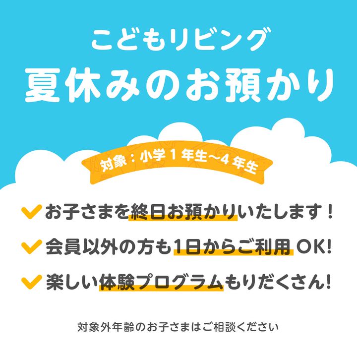 もうすぐ夏休み!過ごし方はもうお決まりですか。こどもリビングでは、会員様以外の方も一日からご利用いただける預かりサービスを実施しています。●スポット利用時間:平日13時~18時利用料:8,800円(税込)/ 1回●スポットロング利用時間:平日10時~18時利用料:13,200円(税込)/ 1回予約フォーム https://kodomo-living.jp/contact/
