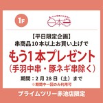 【平日限定企画】串商品10本以上お買い上げで、もう1本プレゼント(手羽中串・豚ネギ串除く)