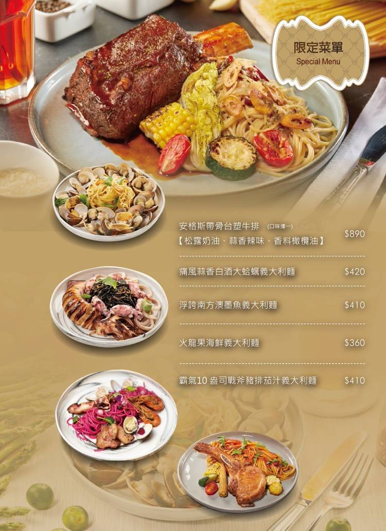 澎湃爸王 四人套餐👍 ➡️最尊榮宗 最超值 最浮誇⬅️ 加購餐點再享單品九折優惠🍝 澎湃浮誇主菜: 美國安格斯16盎司帶骨台塑牛小排🥩 10盎司爐烤香草芥末籽戰斧豬排🪓 酥炸活凍軟殼蟹🦀 黑松露奶油無骨雞腿排🐔 霸氣優惠 $3288 超值主食:麵&飯(五選四) 櫻花蝦松露炒飯🦐 粉紅醬海鮮義大利麵🦞 不二特製茄汁肉醬義大利麵🍝 粉紅醬菌菇燉飯(fish dish) 松露奶油...