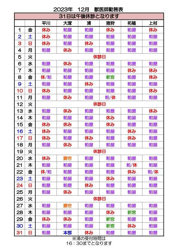 📢お知らせ 12月の獣医師勤務表になります。 変更の場合もありますので、その都度LINEにてご連絡致します。 12月31日は午後休診となります。