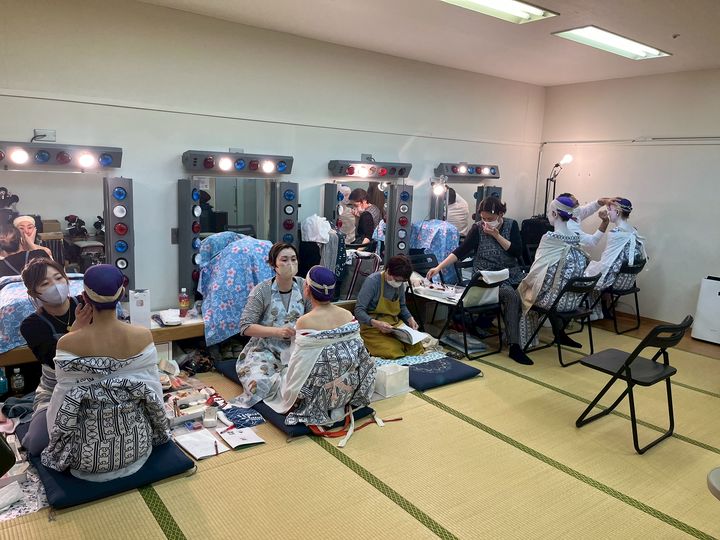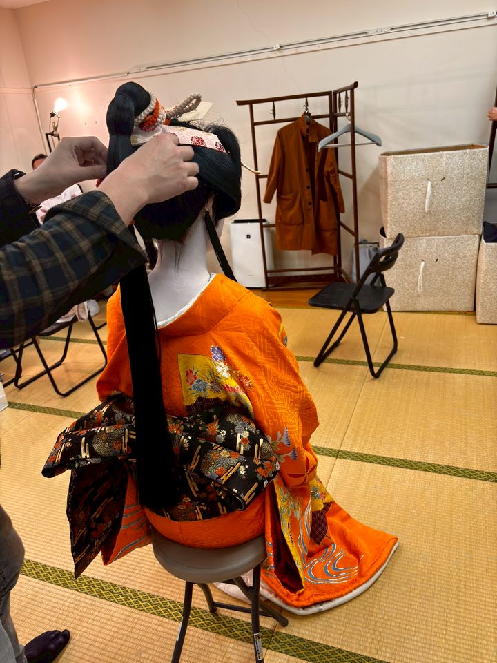 お化粧→着付け→最後に鬘(かつら)を合わせます